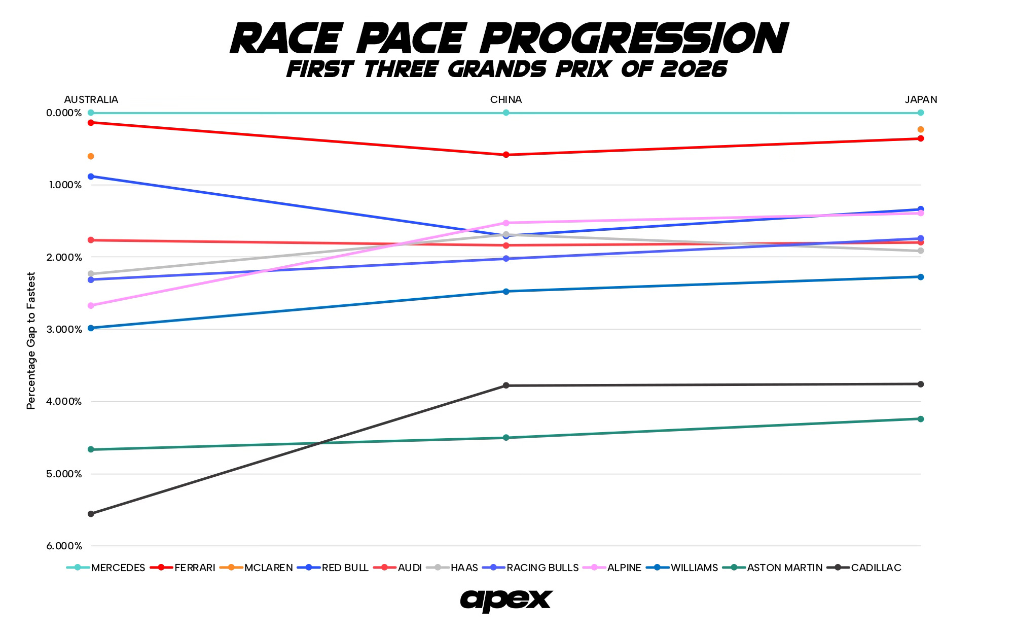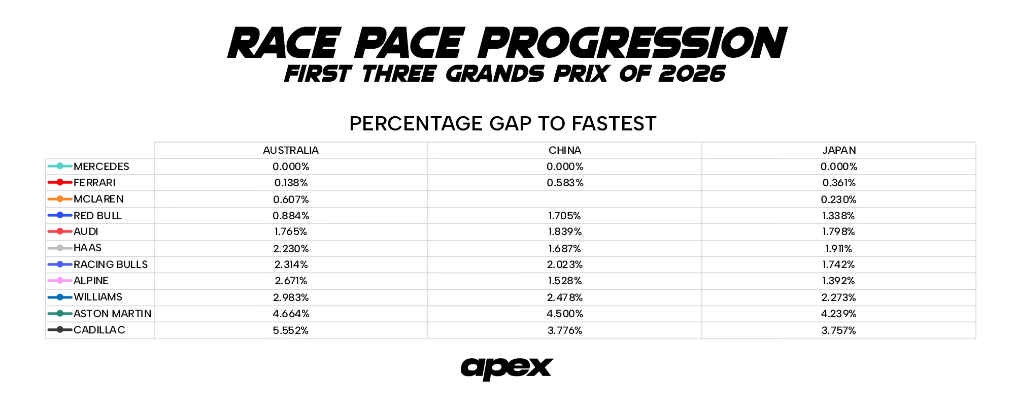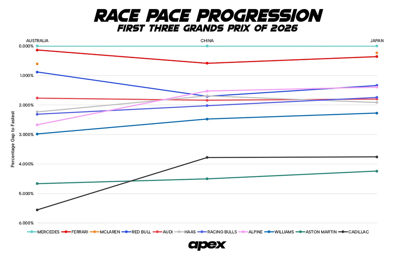 Who’s at the front of that midfield group has also changed. In Melbourne, Audi began their first season under the marque as the fifth fastest team, within 1.4s or 1.7% of Mercedes. But by Shanghai and then into Suzuka, Alpine held that role.