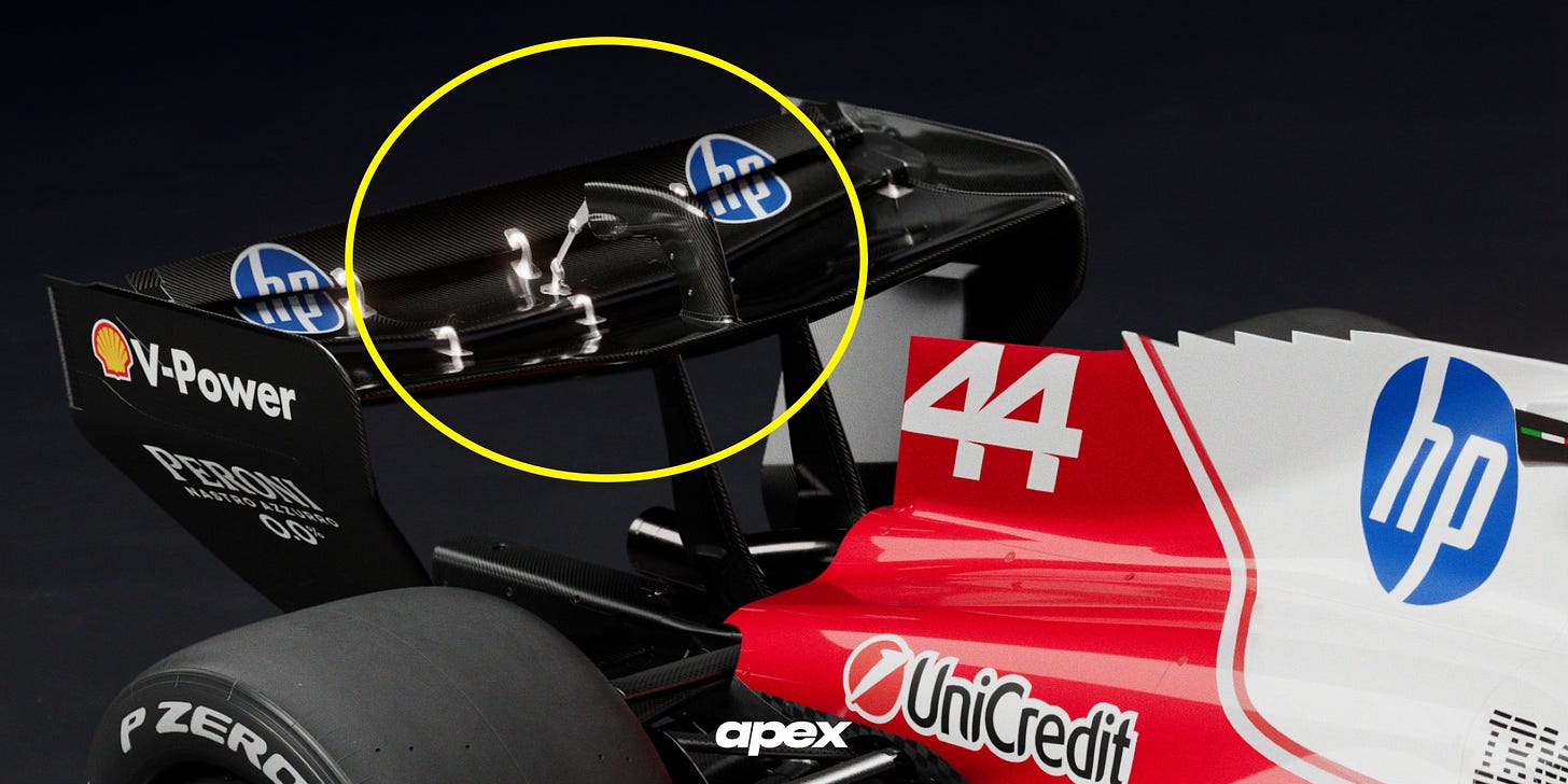 At the rear wing, things appear largely standard - the actuator for the active aerodynamics is very similar to an old-style DRS one, joining to the lower of the active elements, though that itself is connected to the upper one.