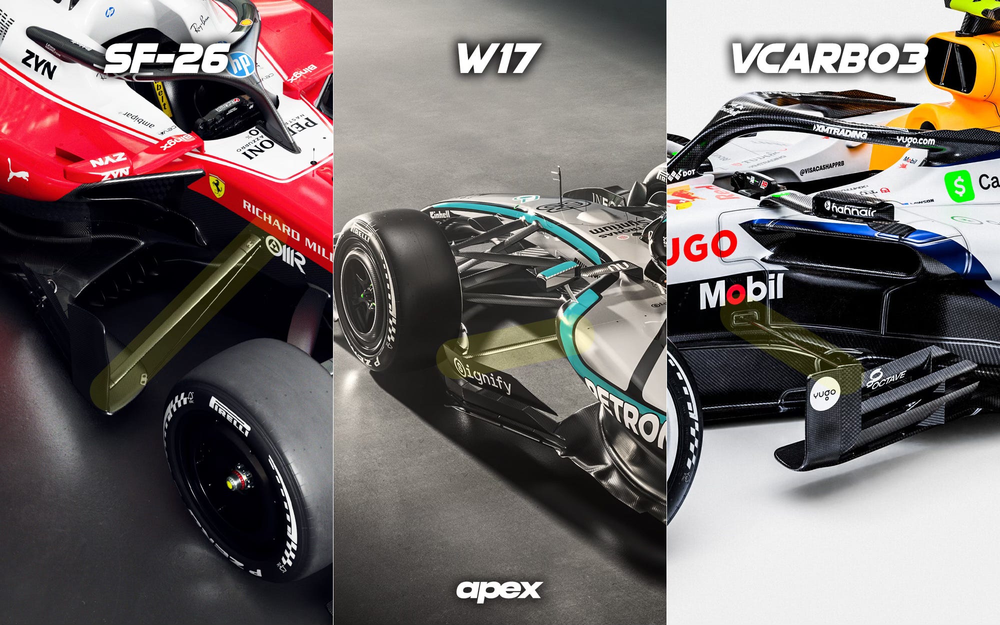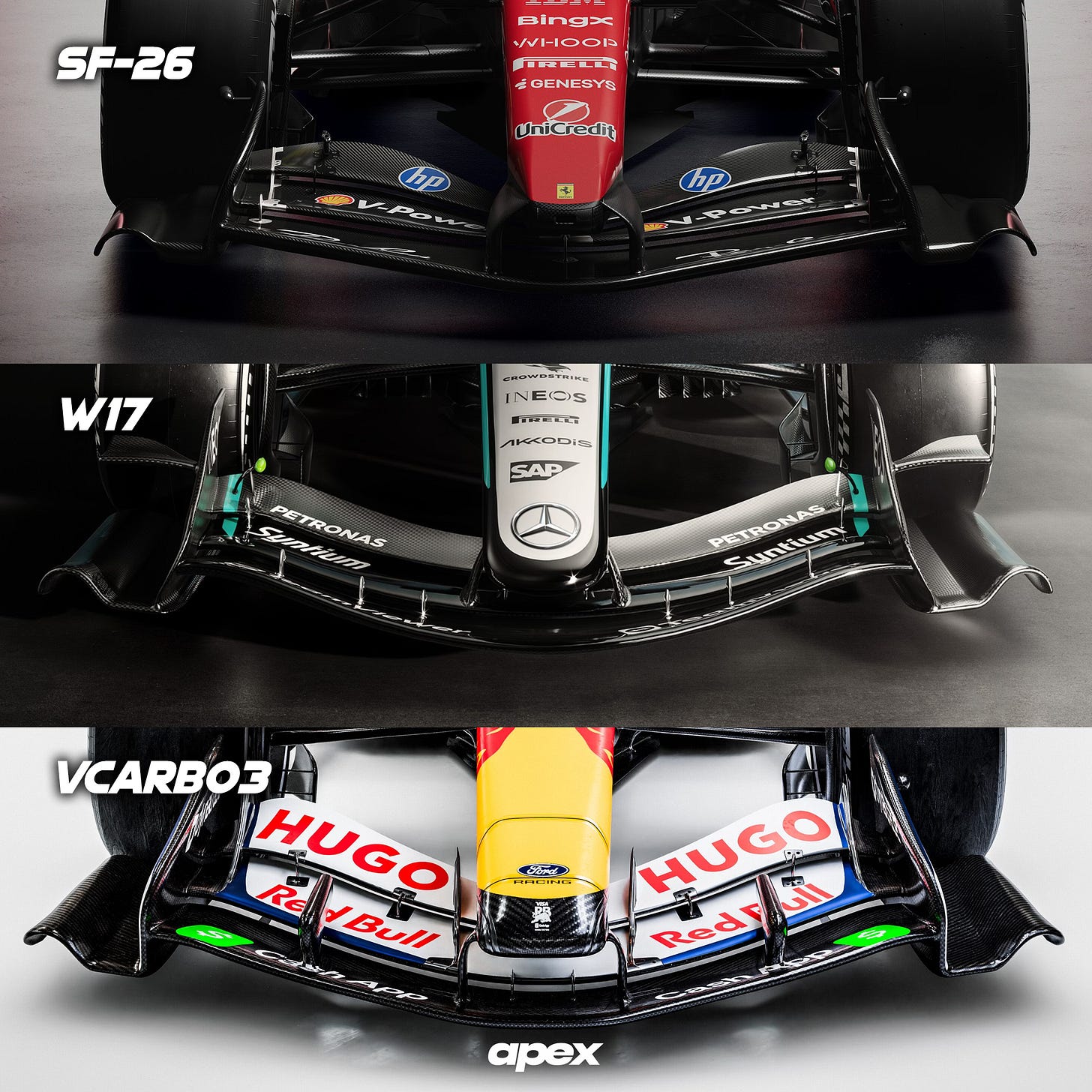 The front wing of the SF-26 stands out as quite unique compared to other early designs given the width of the mainplane versus the upper two (active) elements. It’s perhaps that width that enables the connection with the nose via two rather wide, squared off pylons to happen at the mainplane similarly to the VCARB03, rather than to the second element as we’ve seen from Mercedes. The nose itself is also more tapered in shape and appears to be sitting lower than we’ve seen so far.