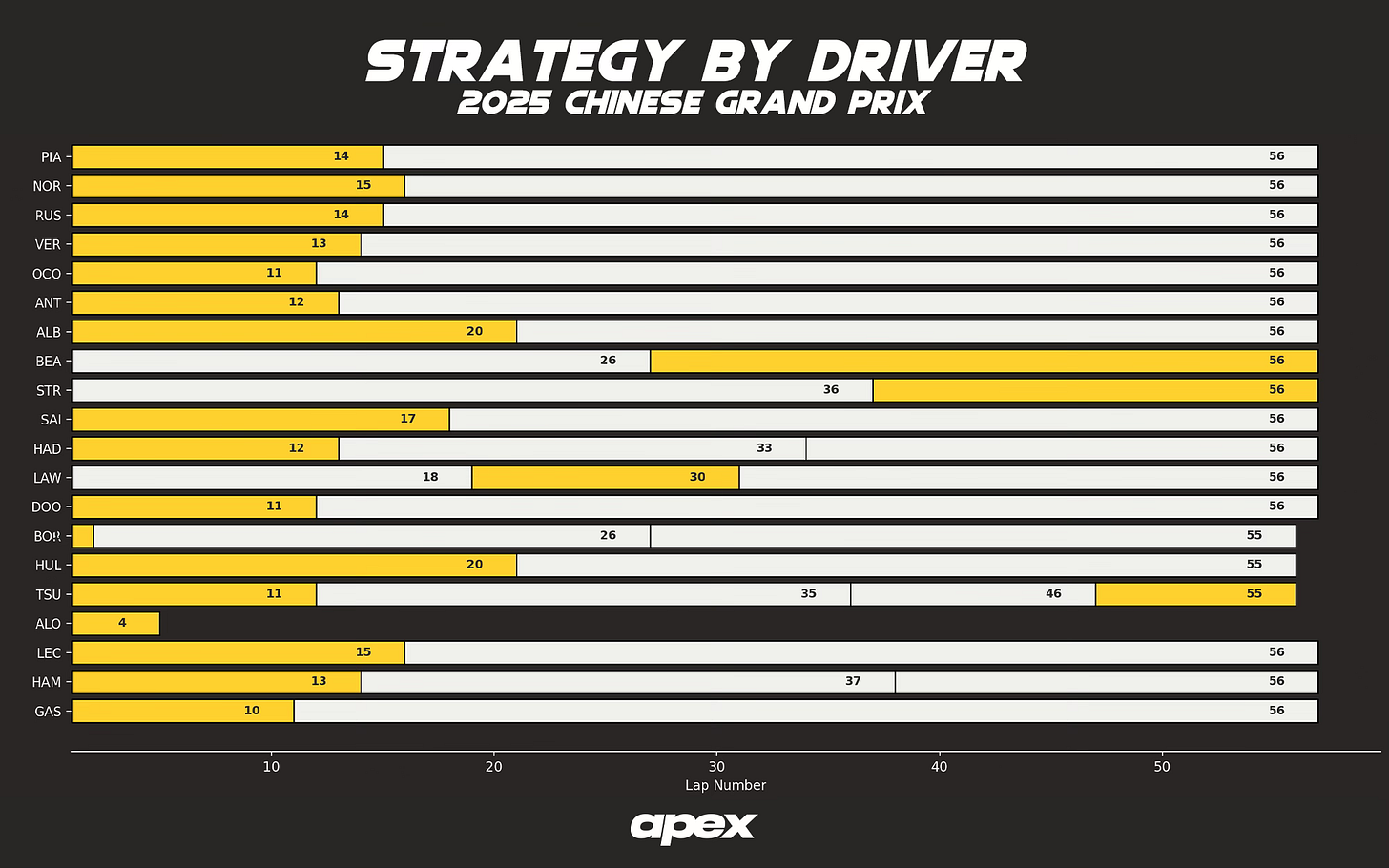 The evidence from Ollie Bearman’s opening stint on the C2 indicated to the rest of the field who’d begun on the medium that switching to a one-stop with a final, longer hard stint was not only feasible, but perhaps optimal. That worked out well for most, with the top five finishers all coming in to switch from the C3 to C2 between laps 13 and 15.