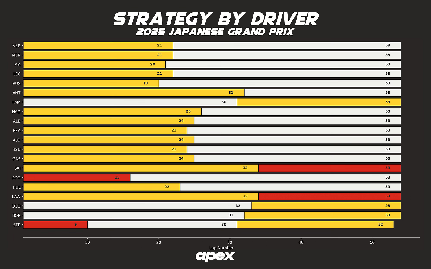 Fifteen cars started on the medium, with two opting for the soft and three choosing to go for the hard. For the majority of the medium-starters, their one and only pitstop came from lap 19-24, but others like Sainz and Lawson were able to extend it to lap 33 to finish their race with a 20-lap soft stint. The top five finishers though opted for the medium-hard one-stop, and just 0.298s separated their race pace.