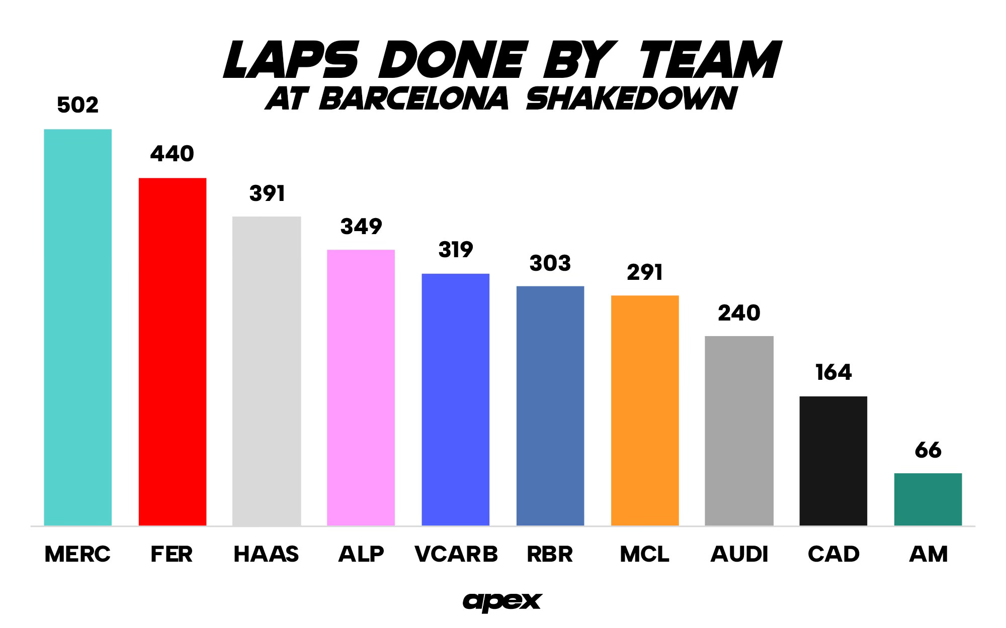With lap times unrepresentative and unofficial, the laps done or mileage by each team over the Barcelona Shakedown week is perhaps the best measure we have of where each of them are at and how reliable their packages were at this early stage.