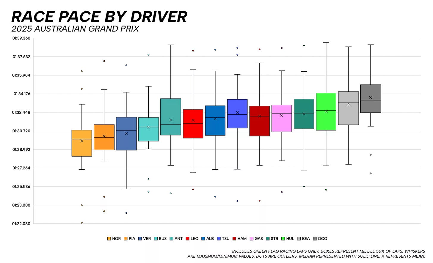 While this may not have been the case, Antonelli’s pace was not to be sniffed at – he ranked fifth for average pace out of the finishing drivers, just behind his teammate Russell but ahead of more experienced drivers like the Ferraris of Leclerc and Hamilton, plus the Williams of Albon and Racing Bull of Tsunoda.